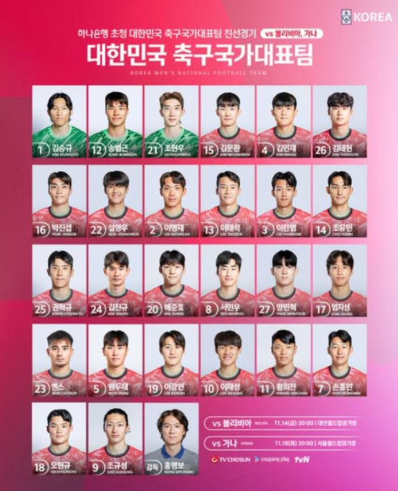 | 한국 볼리비아 평가전 중계 [ 선발 명단 조규성 복귀 ] (0) | 2025.11.14 |