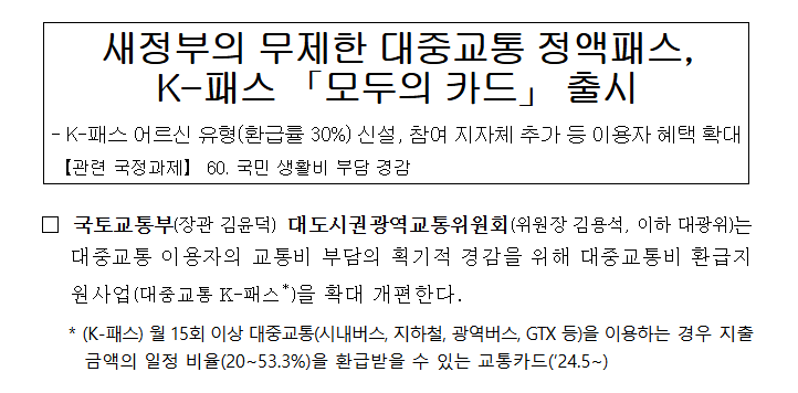 기존의 대중교통 환급 서비스 중 잘 알려진 것이 ‘K패스’입니다. K패스는 일정 비율 또는 일정 금액까지 환급해 주는 구조를 중심으로 설계된 반면, 모두의 카드에서는 기준을 넘는 초과분 전액 환급이라는 구조로 설계됐습니다. 이는 단순 혜택이 아니라 이용자의 실제 교통비 부담을 직접적으로 덜어주는 구조로 변화를 의미합니다. 또한 기존에는 일부 교통수단에만 환급이 적용되거나 환급 비율이 제한적인 경우도 많았지만, 모두의 카드는 보다 넓은 교통수단 적용 범위와 전면 환급 구조를 도입해 실제 환급 체감 효과를 높였다는 점이 핵심 차이입니다.