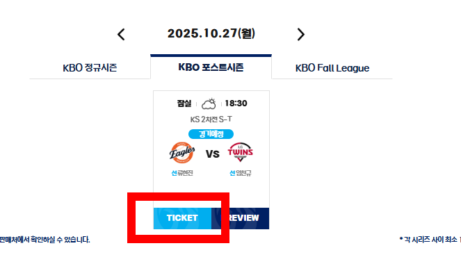 한국시리즈 입장권은 KBO 공식 홈페이지에서 제공하는 경기 요약 화면에서