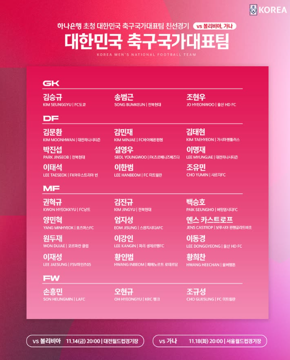 ‘한국 볼리비아 평가전 중계’에 앞서 발표된 선발 명단은 다음과 같습니다:
