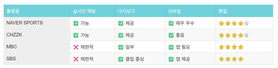 치지직 방송 다시보기 탭에서 제공됩니다. - MBC와 SBS는 TV 편성 외에도 유튜브 및 자사 스포츠 채널을 통해 클립 형태로 업로드됩니다.